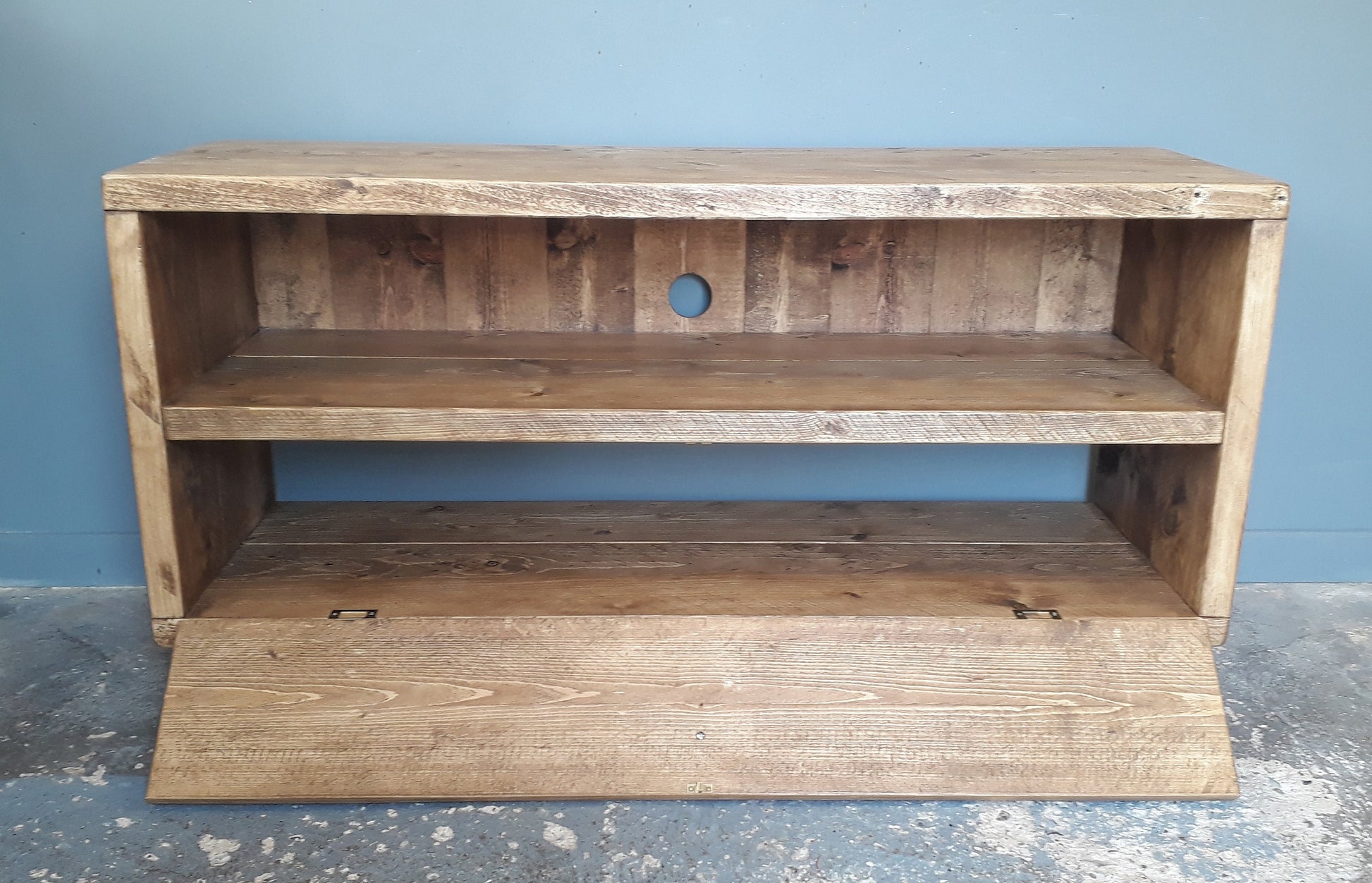 This unit has a flap down door on the lower section to hide your equipment. The fitted back is left off the bottom section if you would prefer a back please contact me.