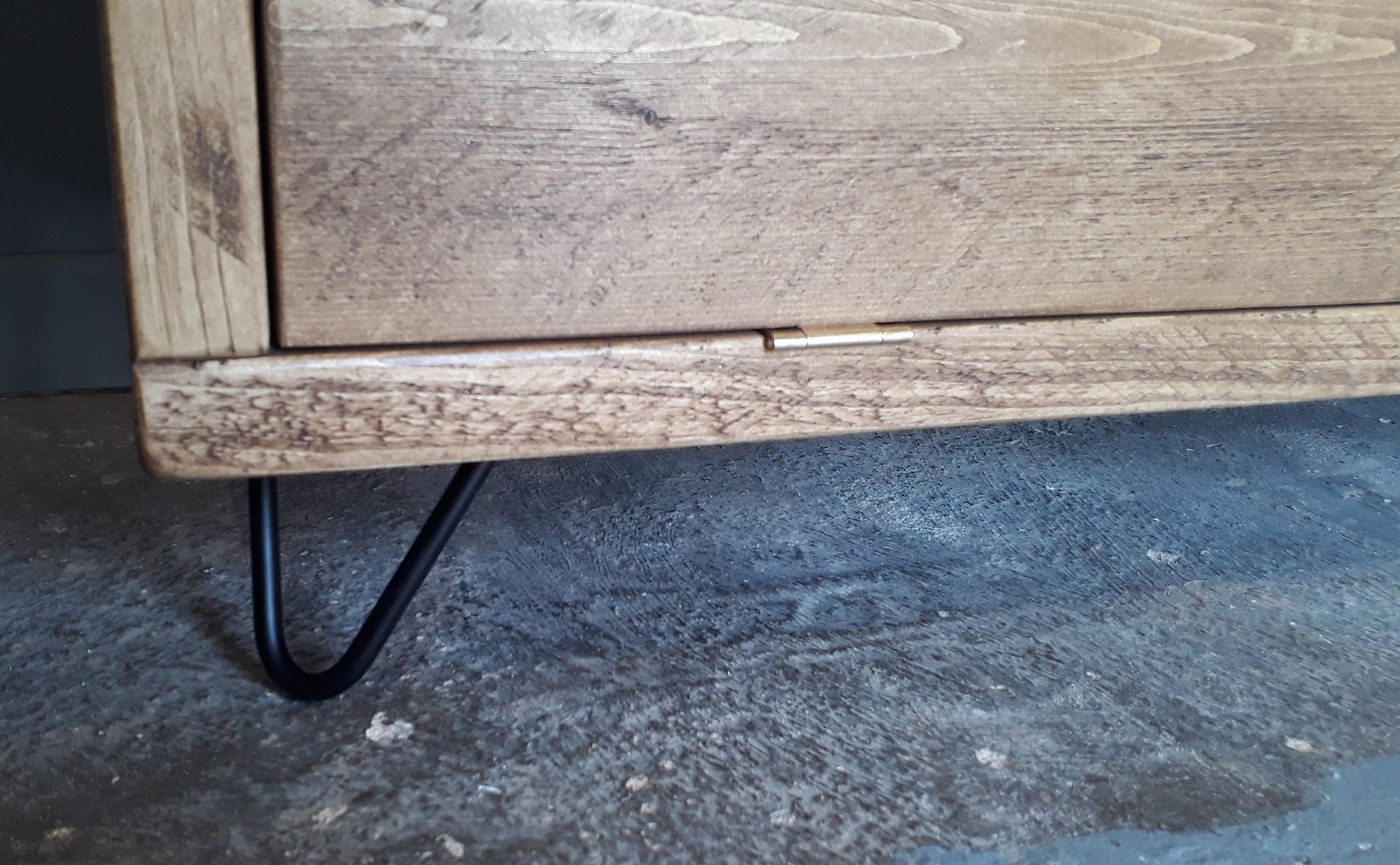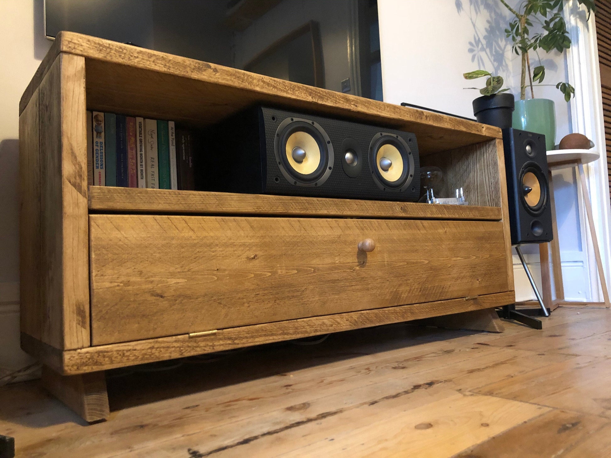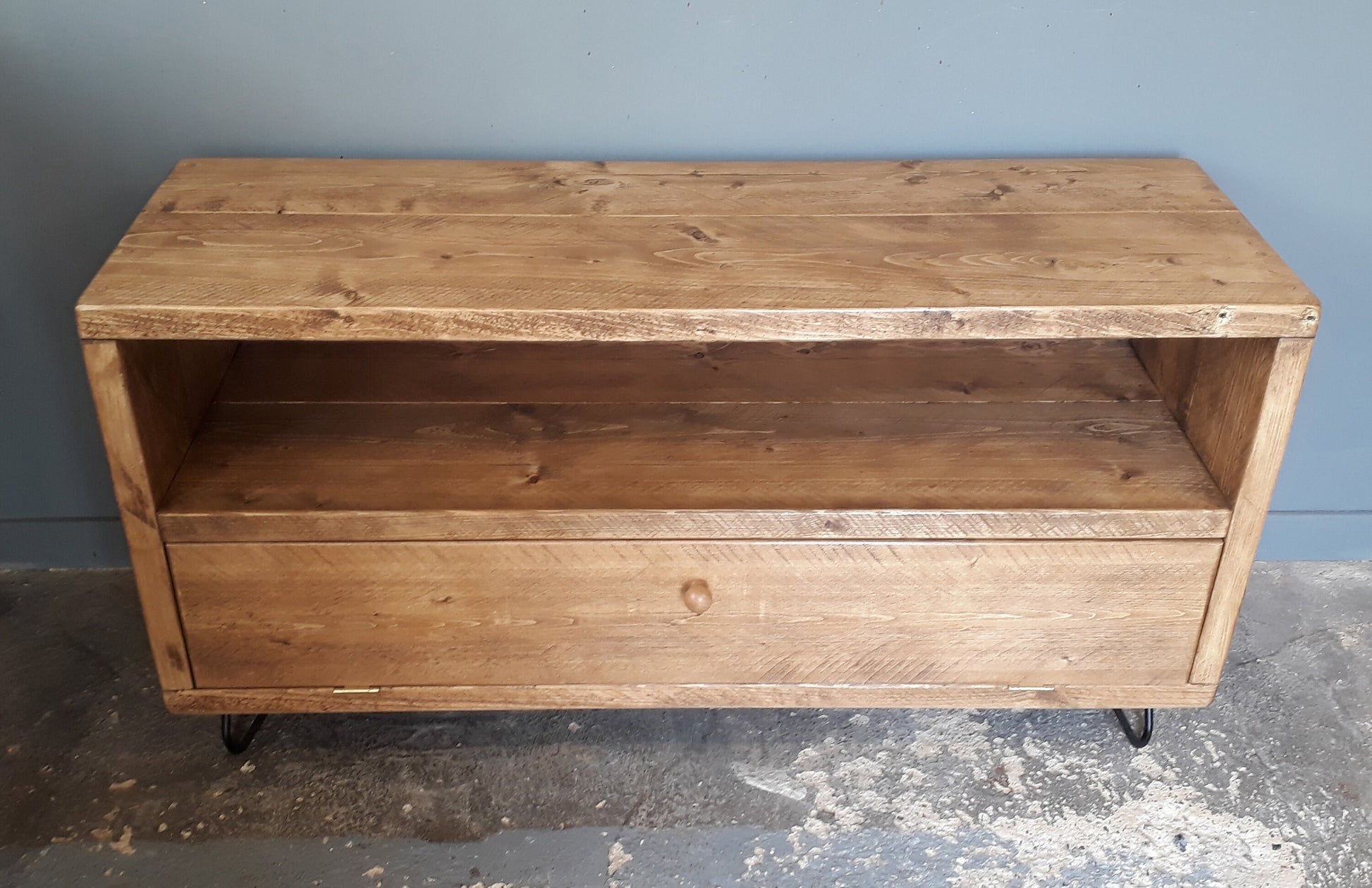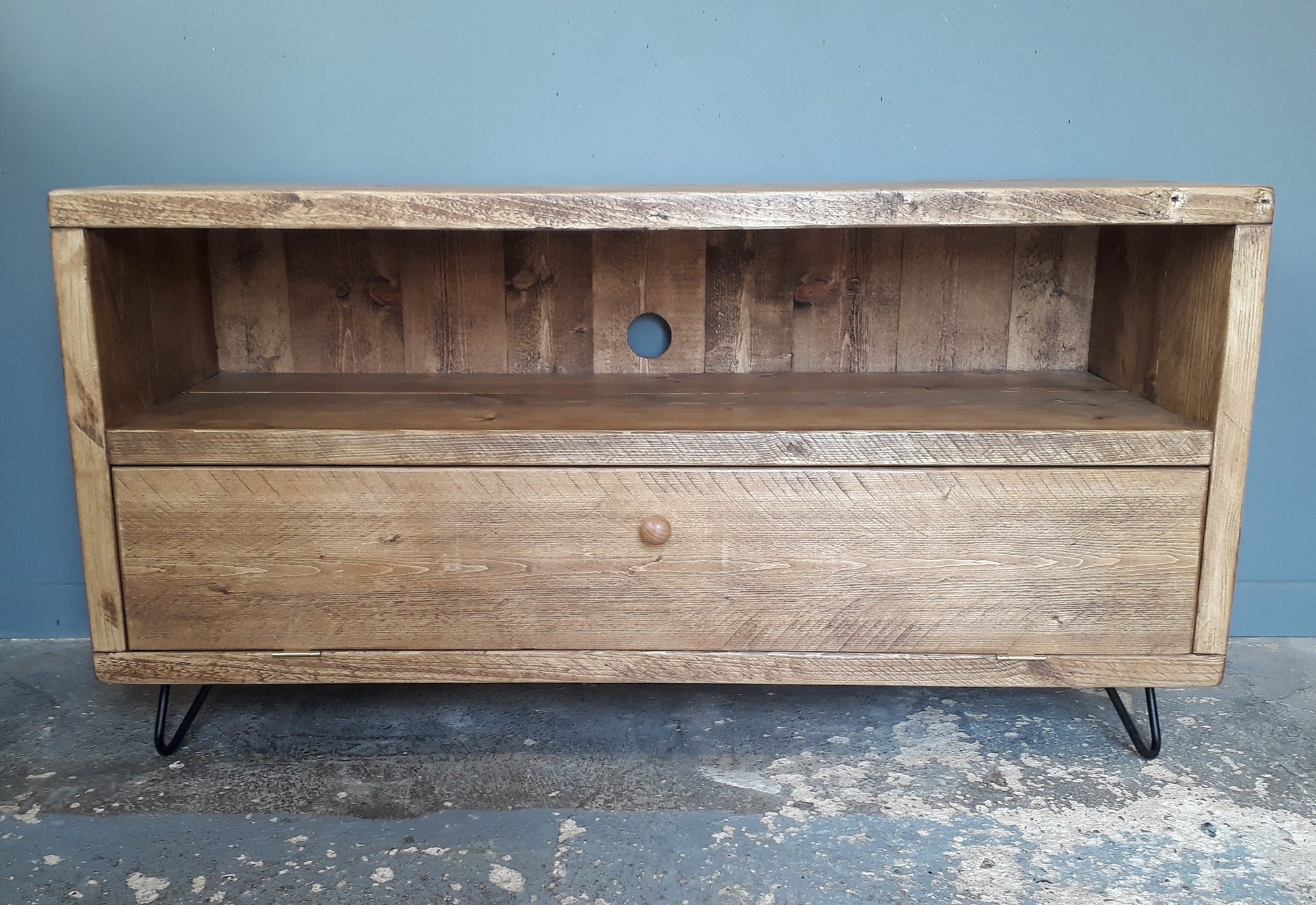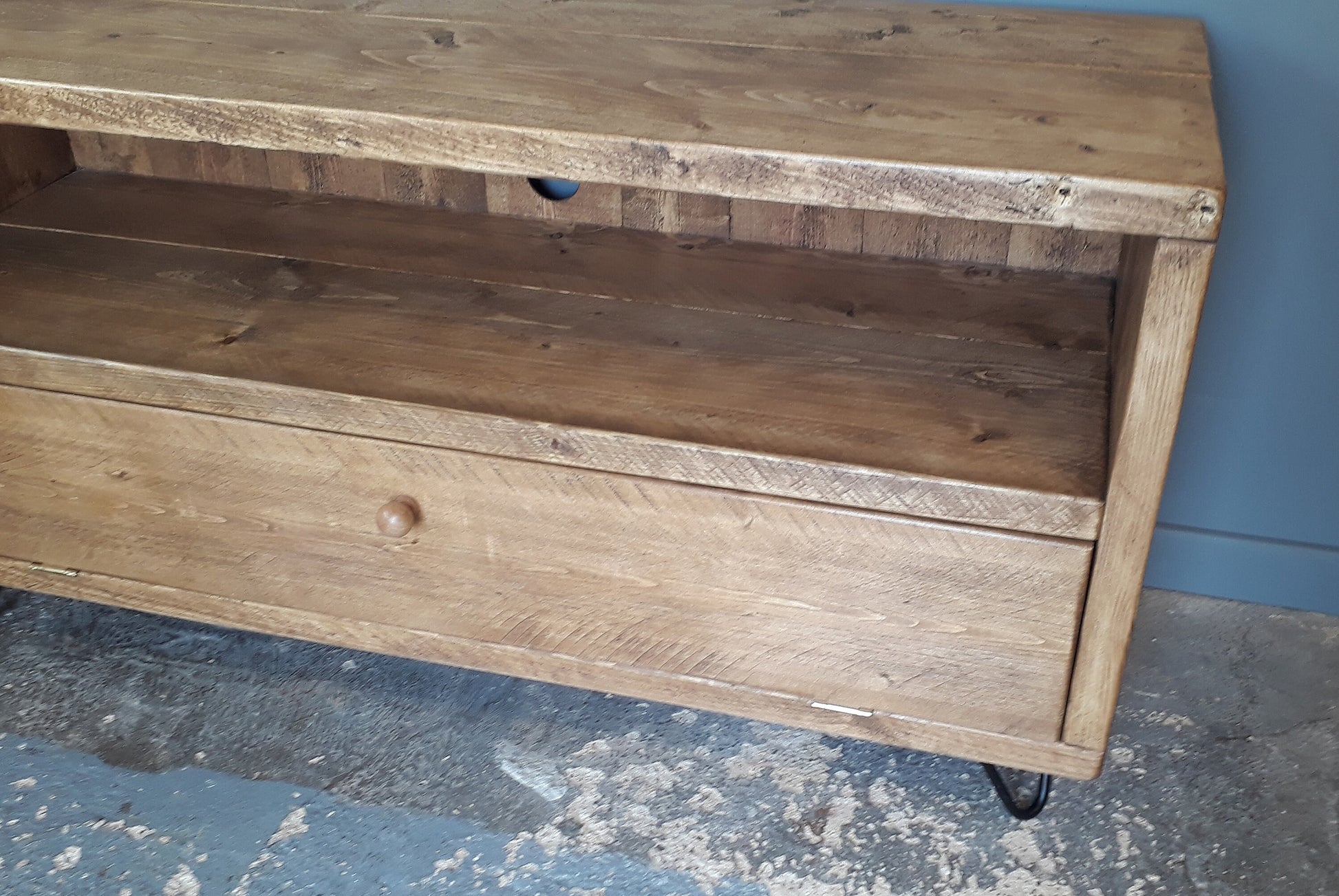 This retro style TV unit is made in my workshop from reclaimed 38mm thick timber. The unit has been fitted together with glue and screws and then sanded, first with a flap disc in an angle grinder, then with an orbital sander to give it a smooth but hand shaped finish.