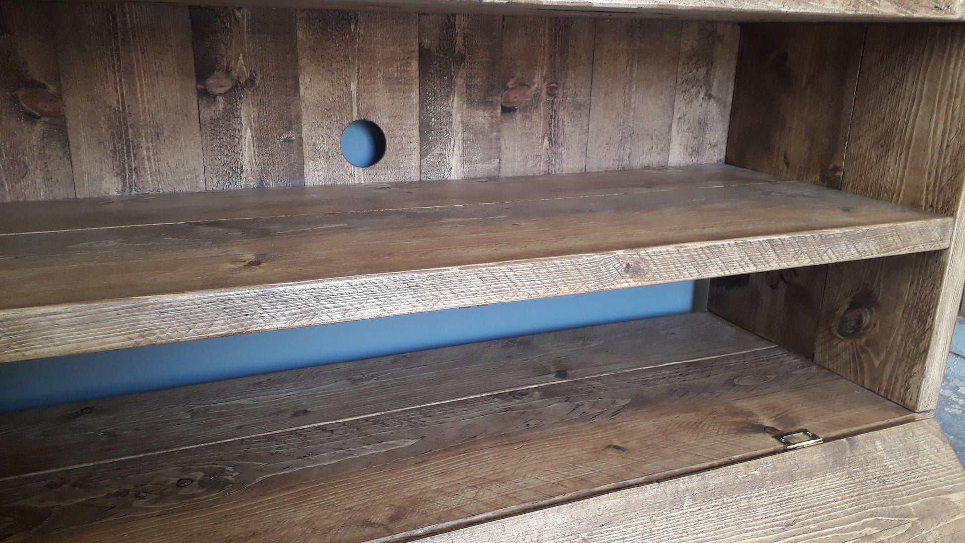 The top section of the unit has a fitted back to hide your cables with a hole for access to your equipment. The base, shelves and top are fixed together with plugged screws to add to the rustic appearance.