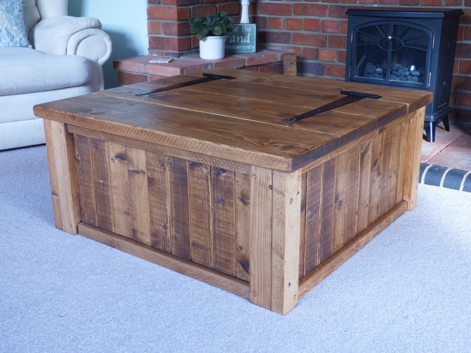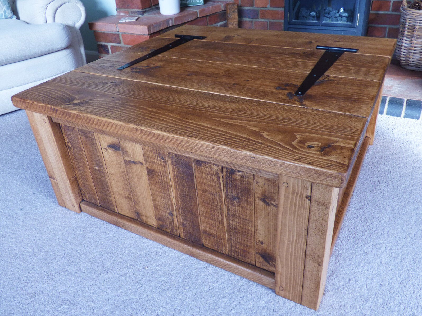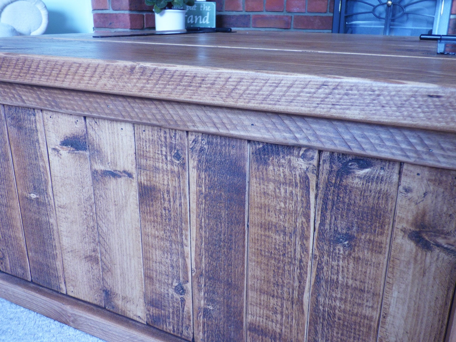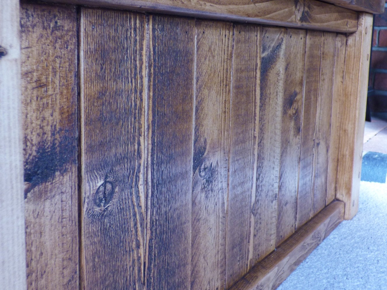 All screws have been plugged to add to the rustic appearance. This particular unit has been waxed with a dark oak finish. See attached photos for other colour options. The inside of the trunk has been left bare as standard so as not to affect items that you may wish to sore inside. If you'd like the inside finished, please let me know.